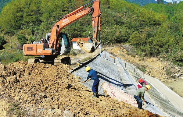 11月13日,绥宁县关峡苗族乡石家塘水库除险加固工程建设工地,工人在忙碌作业。立冬后,该县加快推进中小型水库除险加固和农田水利基础设施建设,为来年农业生产和防汛抗旱夯实基础。