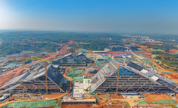 11月14日,湘江科学城交易展示中心建设现场一派繁忙。目前,项目东西立面幕墙玻璃安装已进入收尾阶段,斜屋面铝板施工完成60%,外立面初具规模。
