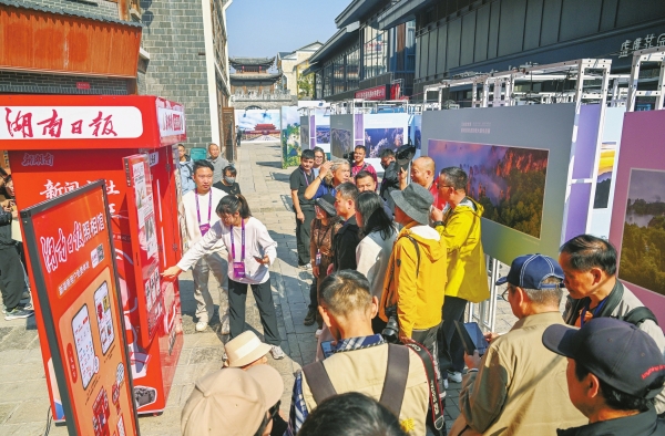 11月16日,摄影爱好者在“湖南日报照相馆”前打卡留念。当天,中国·张家界第三届世界遗产摄影大展在张家界启幕。同时,由湖南日报社、张家界市武陵源区人民政府、张家界武陵源风景名胜区和国家森林公园管理局联合主办的“云端武陵源——航拍武陵源影像大赛作品展”开展。