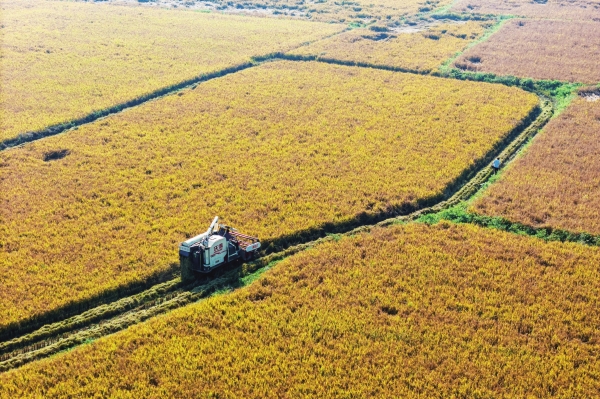 11月16日,双峰县梓门桥镇合心村,农民驾驶着收割机收割晚稻。初冬时节,该县晚稻进入收获尾声,收割机在金黄稻田中穿梭作业,确保秋粮颗粒归仓。