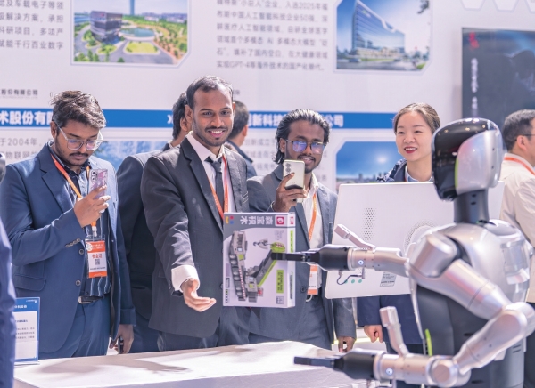11月20日,长沙北辰国际会议中心,观众在2025世界计算大会创新成果展示区体验智能物流分拣机器人。