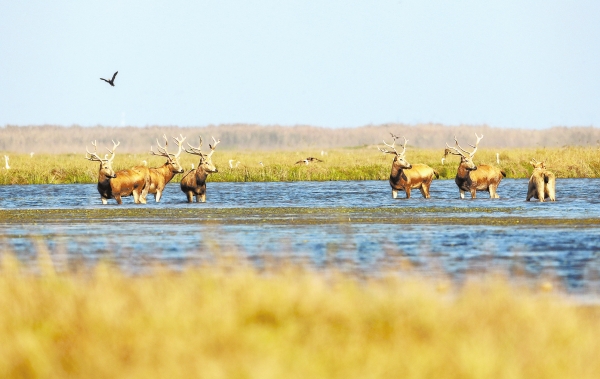 11月28日,在位于南洞庭湖区的沅江市,6只麋鹿在陈家湖的湖洲上觅食栖息。初冬的暖阳下,麋鹿与越冬候鸟和谐共处,构成一幅生动的生态画卷。