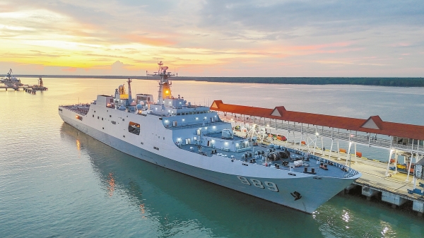 12月2日,中国海军989编队舰船靠泊在马来西亚巴生港(无人机照片)。中国海军989编队结束对马来西亚为期4天的友好访问,3日从马来西亚巴生港启程前往印度尼西亚。新华社 发