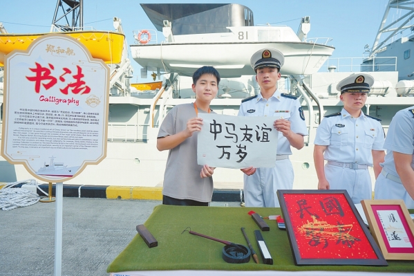 12月1日,在马来西亚巴生港,参观者在中国海军989编队组织的舰艇开放活动上展示书法。新华社 发