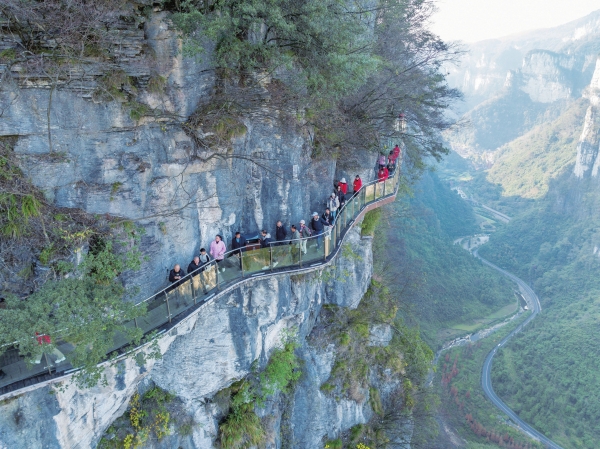 12月6日,吉首市矮寨奇观旅游区,游客在悬崖玻璃栈道观光游览。该景区凭借独特的万年峡谷风光、千年苗寨风情和百年路桥奇观,成为冬季旅游的热门目的地。彭璟 摄(湖南图片库)