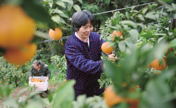 洞口县毓兰镇杨柳村,农民在采收柑橘。