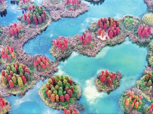 12月7日,大雪节气,长沙市大泽湖近自然湿地公园圆形树岛上的水杉树叶大多已变成红色,成为冬日里一道亮丽的风景线。这些水杉林与湿地景观融为一体,吸引市民纷纷前来观光打卡。