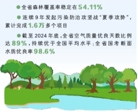 环境质量持续改善。我省连续9年发起污染防治攻坚战“夏季攻势”,累计推进并完成了1.6万多个项目。截至2024年底,全省空气质量PM2.5平均浓度为36.1微克/立方米,较2019年下降12.6%。优良天数比例达89%,持续优于全国平均水平。全省国考断面水质优良率为98.6%,洞庭湖湖体总磷浓度比2019年下降13.6%。