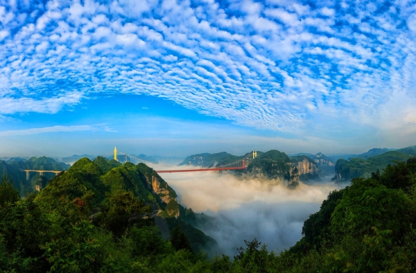 武陵云深处,德夯大峡谷的晨雾尚未散尽,1779米的矮寨大桥已披着霞光凌空飞渡。桥上,举着自拍杆的游客正惊叹“云端奇迹”。