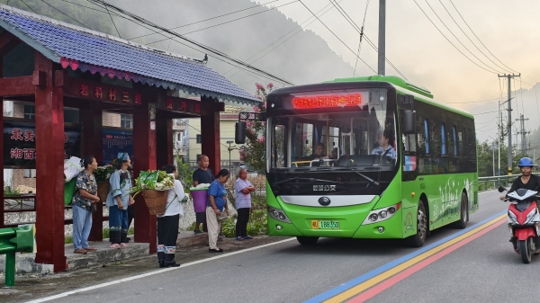 崇山峻岭间,一条条银色公路如玉带缠绕,蜿蜒穿行于苍翠的群山之中,满载山货的绿色公交行驶在青山绿水间。