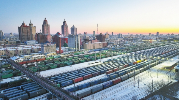 12月10日,伴随一列编组60辆满载家用电器和数码产品的中欧班列驶出满洲里铁路口岸,今年中欧班列“东通道”(由满洲里、绥芬河、同江铁路口岸组成)通行班列数量已达5166列,运送各类货品超53万标准箱。图为当日,中欧班列在满洲里站整装待发(无人机照片)。