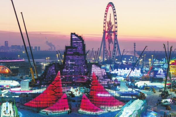 12月10日,第二十七届哈尔滨冰雪大世界主塔“冰灯启梦”封顶,进入最后细节打磨和灯光调试阶段,即将惊艳亮相。据悉,主塔“冰灯启梦”总用冰量39000立方米,是本届哈尔滨冰雪大世界园区最高、单体最大的冰建景观。图为当日拍摄的主塔施工现场(无人机照片)。