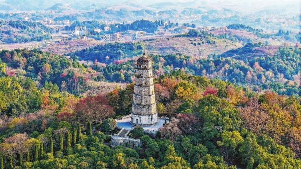 12月11日,新田县中山街道,斑斓山色与青云古塔相映成趣。近年来,该县坚持生态优先、绿色发展理念,持续加强城乡生态环境保护,通过建设城郊生态绿地,打造15分钟休闲圈,更好地满足市民健身与游憩需求。