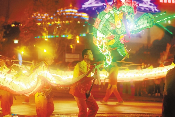 12月12日晚,通道侗族自治县萨岁广场上演精彩舞龙表演,吸引众多市民、游客观赏。近年来,该县通过打造集观演、美食、非遗体验于一体的夜间消费场景,促进文旅融合发展。