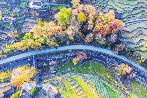 12月15日,城步苗族自治县长安营镇古枫林迎来最佳观赏期,红黄相间的树叶在冬日暖阳下熠熠生辉。