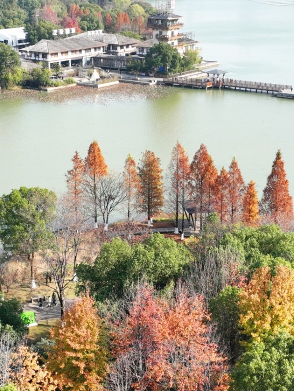 12月13日,长沙市开福区月湖公园,红黄绿相间的树木与清澈湖水交相辉映,构成一幅人与自然和谐共生的美丽画卷。