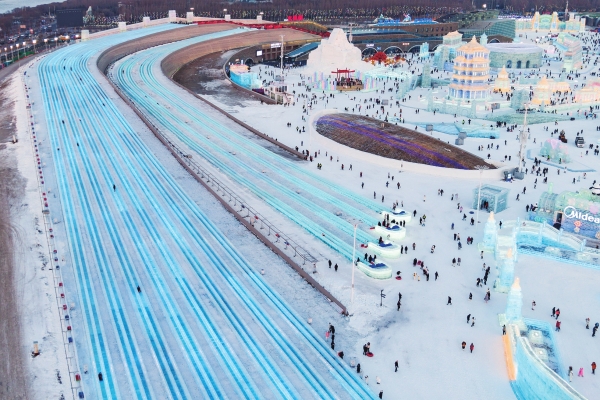 12月17日上午10时,第二十七届哈尔滨冰雪大世界正式开园迎客。园区占地面积达120万平方米,总用冰用雪量突破40万立方米,为历届之最。图为当日游客在哈尔滨冰雪大世界园区体验“超级冰滑梯”(无人机照片)。