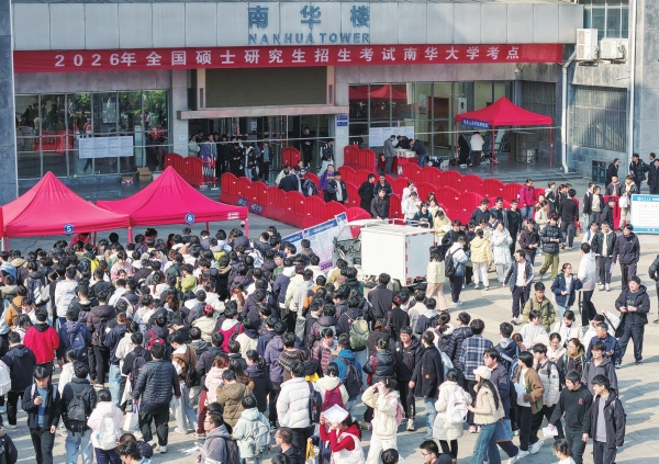 12月20日,南华大学考点,考生有序进入考场。当天,2026年全国硕士研究生招生考试初试开考。2026年湖南省研考报名人数共有13.61万人,比上一年减少1.31万。