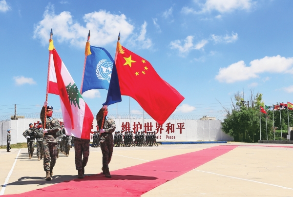 2022年7月1日,在黎巴嫩南部辛尼亚村的中国维和部队营区,中国维和部队官兵在受勋后通过观礼台。联合国驻黎巴嫩临时部队(联黎部队)当日授予中国第20批赴黎巴嫩维和部队全体410名官兵联合国“和平勋章”,以表彰他们为黎巴嫩南部地区和平稳定作出的突出贡献。新华社 发
