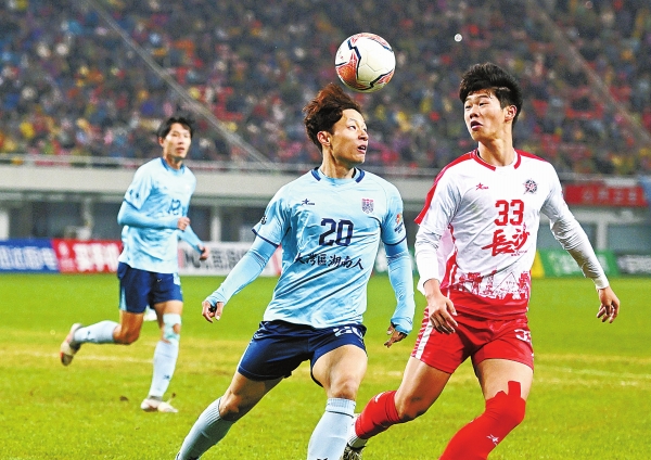12月24日晚,球员在雨中拼抢。当天,长沙队VS大湾区湖南人队湘超友谊赛在长沙贺龙体育场举行,长沙队以3∶2获胜。