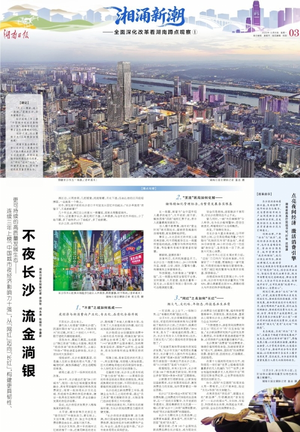 基层是国家治理的神经末梢,也是感知改革温度最灵敏的探头。五一商圈日均人流超百万,是观察改革成效的“微观窗口”。该商圈管委会主任何庭洁对开篇之作《不夜长沙,流金淌银》给予充分肯定:“它系统梳理了从制度创新到文化赋能的‘长沙模式’,也直面了我们正在经历的成长烦恼。接下来,我们将紧扣报道启示,继续以改革思维破解新课题,努力将五一商圈打造为彰显活力、体现温度的‘城市会客厅’。”