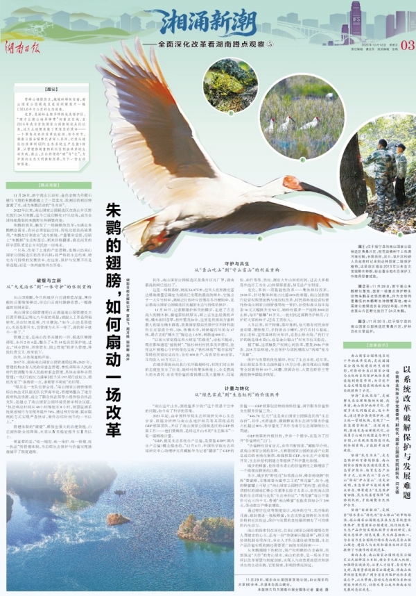 邵阳城步南山国家公园候选区负责人周建宏认为,报道以“朱鹮回归”为切入口,精准捕捉了南山从“九龙治水”到“一体守护”、从“靠山吃山”到“守山富山”的改革脉络,让生态改革的“湖南智慧”被更多人看见。