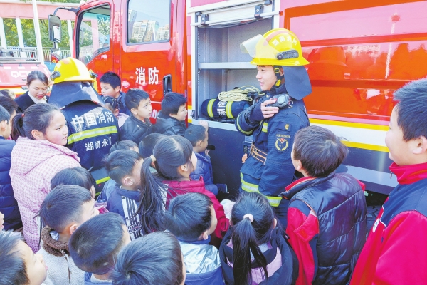 12月26日,学生在参观消防装备。当天,永州市冷水滩区消防救援大队宣传服务队走进银象小学,开展消防安全培训演练活动,切实提升该校师生消防安全意识和应急避险能力。