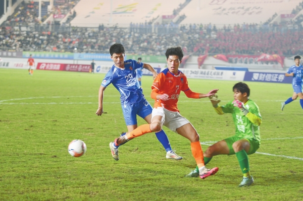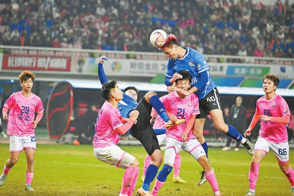 12月27日晚,永州队球员谷文杰头球破门瞬间。当晚,永州队以1比0战胜常德队,获得2025湘超联赛冠军。 |