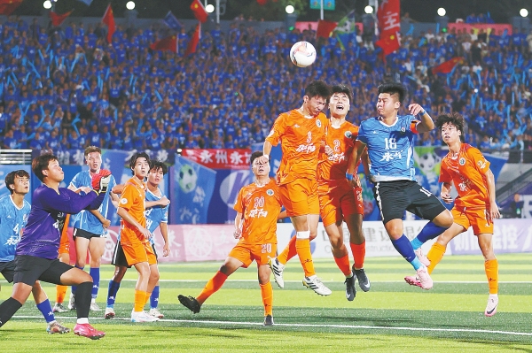 10月12日晚,永州市体育场,邵阳队(橙)球员在比赛中争夺头球。 |