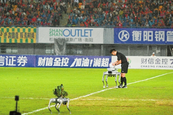 10月18日晚,衡阳市体育中心,由衡阳本土研发的智能机器狗作为“开球嘉宾”携比赛用球入场,成为赛前一大亮点。 |