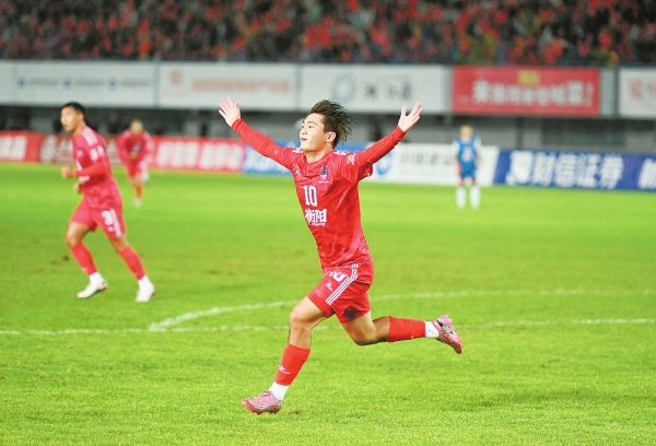 10月18日,衡阳队10号球员吴梦豪进球后庆祝。当天,湘超联赛第六轮比赛,衡阳队主场6比2胜湘西队,创造了湘超联赛的最大比分记录。 |