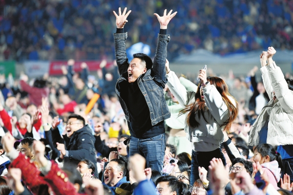 12月20日晚,在湘超半决赛“第二现场”永州市体育场,市民欢呼庆祝永州队进球。 |