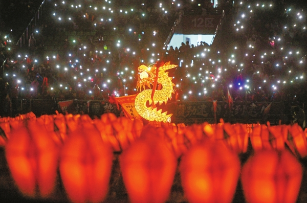 10月19日晚,张家界贺龙体育中心,板板龙灯光秀为湘超对决增添了一份火热。 |