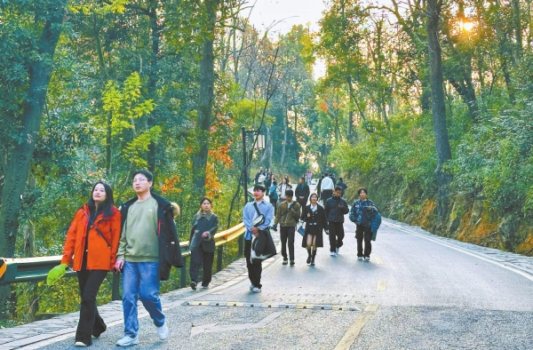 12月29日,市民、游客在长沙岳麓山景区参观。冬日暖阳下,大家走进苍松翠柏间,享受美好时光。