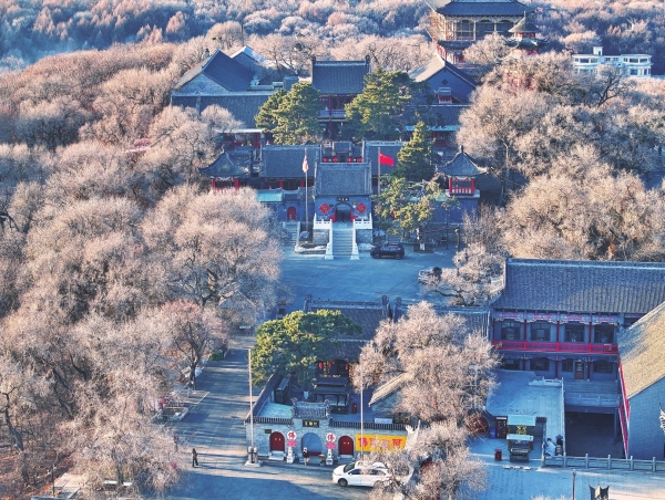 白山黑水抱江城,万里冰封接远空。初冬的吉林省吉林市,晴空之下,朔风卷起晶莹的雪沫,《楹联中国行》栏目组踏雪寻踪,寻访一副悬于北山玉皇阁万绿轩的名联: