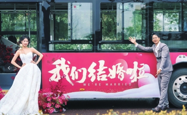 常德的婚庆公交面向结婚新人提供婚礼接驳服务。低碳环保的同时,成本仅为传统婚礼车队的三分之一,每辆车可容纳约50位亲友,还提供气球、彩带、LED灯等定制服务。今年以来,婚庆公交已见证70余对新人的甜蜜时刻。