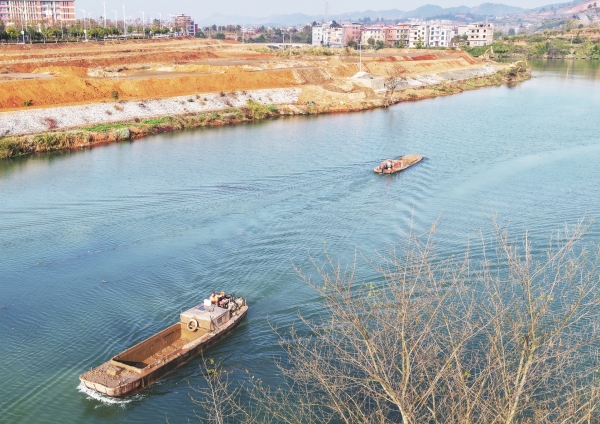1月3日,嘉禾县钟水河滨江段,施工人员在疏浚河道。元旦假期,该项目不停工,全力推进治理进度。