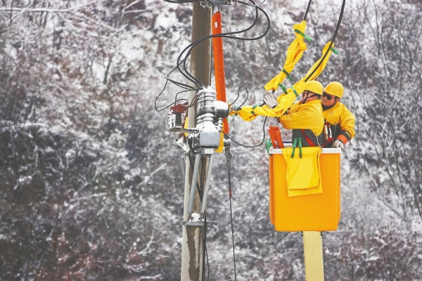 龙山县里耶镇八面山,国网龙山县供电公司员工顶风冒雪带电作业。