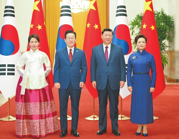会谈前,习近平和夫人彭丽媛在人民大会堂北大厅为李在明和夫人金惠景举行欢迎仪式。