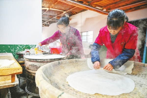 1月5日,澧县盐井镇白马庙村,村民在作坊制作手工荞麦豆皮。每到冬季,当地群众都有制作荞麦豆皮的传统习俗,既可用于日常食用,也可用于款待宾客。临近春节,不少作坊与村民纷纷开始制作荞麦豆皮,让它成为记忆中最温暖的年味,更发展成为助农增收的特色产业。