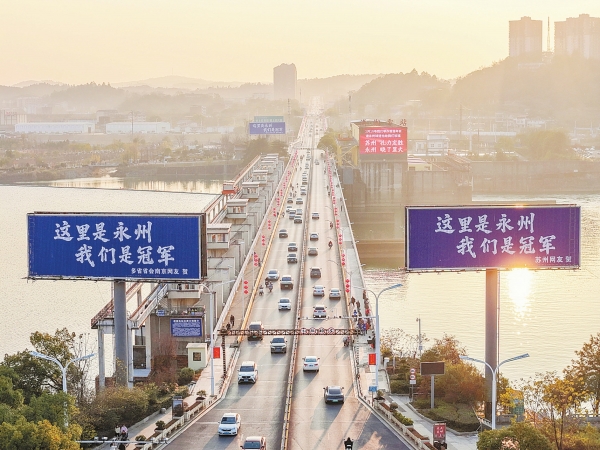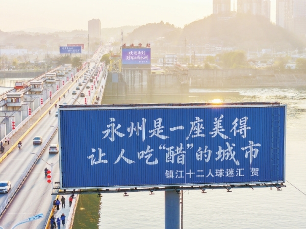 让人感到意外却又暖心的是,江苏泰州、南通、昆山、常州等地的祝贺广告纷至沓来,“占据”了宋家洲大桥的多个大型户外广告牌、步步高环形天桥周边等多地的电子显示屏,用词更加热烈和充满激情:“永州是一座美得让人吃‘醋’的城市——镇江十二人球迷汇贺”“湘超黑马,冠军永州——苏超冠军泰州网友贺”“宇宙昆山跨千里,致敬冠军永州城——昆山球迷联盟贺”……