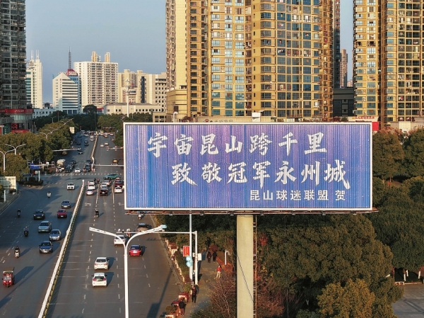 1月7日,永州市冷水滩区宋家洲大桥桥头,多个统一成蓝底白字样式的大型户外广告,成为一道亮丽的风景线。广告词分别有“这里是永州,我们是冠军”“这里是永州,冠军专属‘州’”……落款是远在千公里之外的江苏南京、苏州、泰州、南通等地的网友和球迷,引发众人关注。
