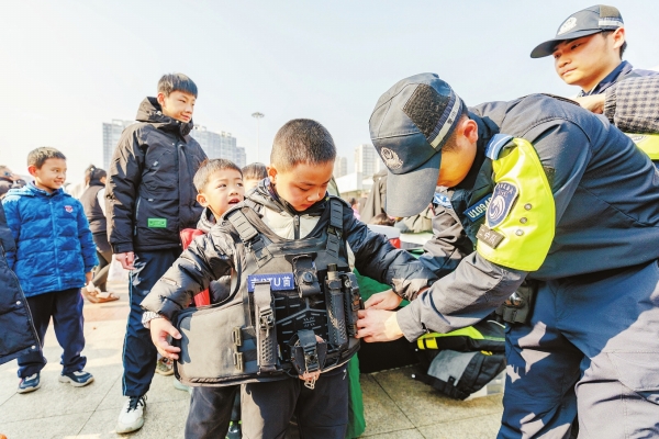 1月10日,吉首市警营开放日暨岁末年初集中宣防活动现场,民警给小朋友讲解警用装备使用知识。