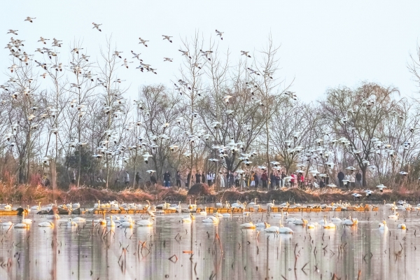 1月11日,成群候鸟在岳阳市屈原管理区东古湖栖息翱翔,吸引不少观鸟爱好者来此“追鸟”。