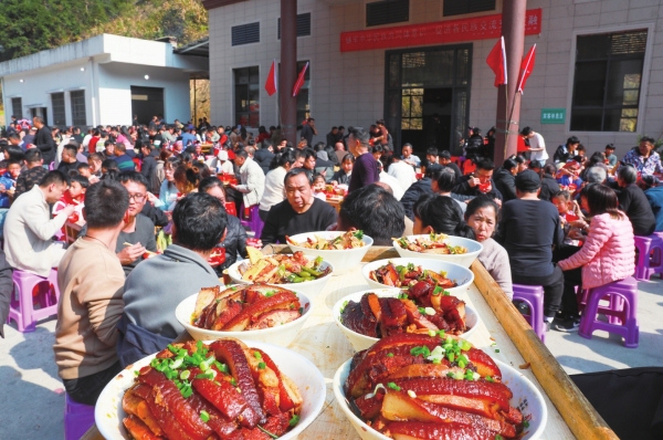 1月18日,游客和瑶胞在品尝瑶族特色年猪宴,体验瑶乡年味。当天,新田县门楼下瑶族乡竹林坪村举办“瑶乡团圆年猪宴,同心共筑团结情”传统美食节活动。
