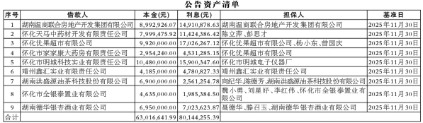 怀化农村商业银行股份有限公司与中国东方资产管理股份有限公司湖南省分公司于2025年12月29日签订《债权转让协议》,怀化农村商业银行股份有限公司将其对本公告附件“公告资产清单”所列借款人及其担保人享有的主债权、担保合同项下的全部权利及相关附属权益,依法转让给中国东方资产管理股份有限公司湖南省分公司。怀化农村商业银行股份有限公司特公告通知各借款人、担保人以及因各种原因发生更名、改制、歇业、吊销营业执照或丧失民事主体资格等情况的相关承债主体或清算主体。