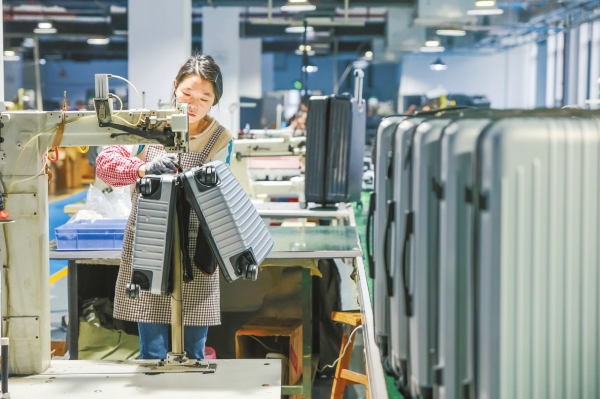 1月27日,蓝山县皮具箱包特色小镇的勤工箱包有限公司生产车间,工人在赶制订单产品。春节前夕,该县皮具箱包特色小镇各企业开足马力生产,力争“开门红”。