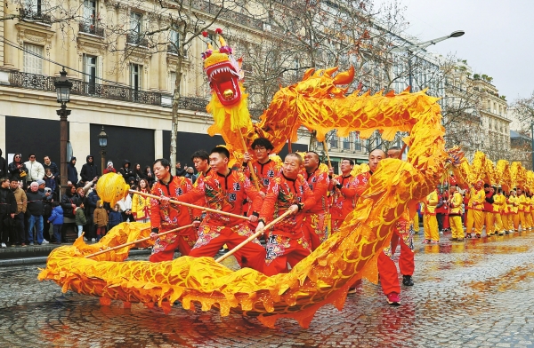 “欢乐春节满巴黎·龙狮贺岁舞香街”春节巡游活动2月1日在法国首都巴黎的香榭丽舍大街举行,庆祝即将到来的农历春节。这是该活动第四次亮相香榭丽舍大街,由机器人引领的春节巡游表演方阵和紧随其后的舞龙舞狮、民族舞等传统表演,吸引了大街两侧的巴黎市民和游客驻足观看。图为当日,人们在巡游活动上表演舞龙。