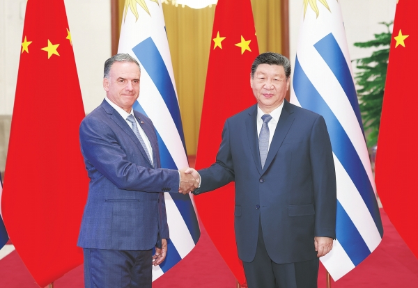 习近平指出,当今世界正处于百年未有之大变局,国际形势变乱交织,单边霸凌愈演愈烈,中方支持乌拉圭接任“77国集团和中国”轮值主席国,愿与乌方加强全球南方团结协作,共同推进平等有序的世界多极化、普惠包容的经济全球化,携手并进、共谋发展,为构建人类命运共同体作出更大贡献。中方始终重视中拉关系,支持拉美和加勒比国家维护自身主权、安全、发展利益,支持乌拉圭接任拉美和加勒比国家共同体以及南方共同市场轮值主席国,愿同乌方和地区国家推动共建中拉命运共同体走深走实。