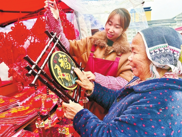 2月4日,通道侗族自治县城东年货集市,一位老人正在选购“马上有福”挂件。春节临近,以马为主题的各类饰品热销,成为市民购置年货的首选。